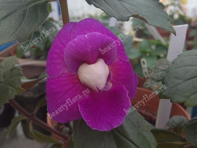 Крупный до 6 см. цветок темно сиреневый махровый.