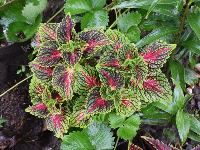 Колеус Spacecake - симпатичный пестролистник. Он привлекает внимание своими необычными листьями, которые напоминают крапиву, имеют пильчатый край. Поверхность листьев бархатистая, а цвет -зеленый с бордовым.