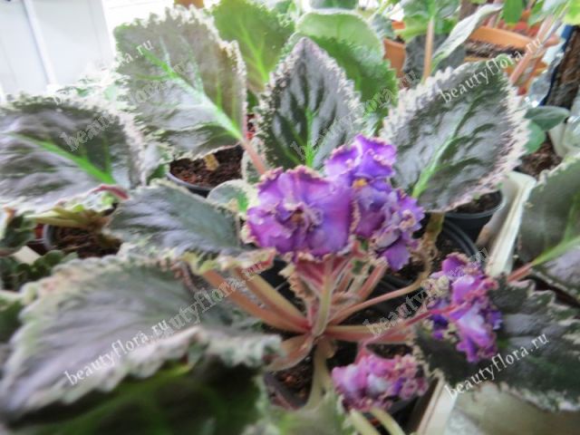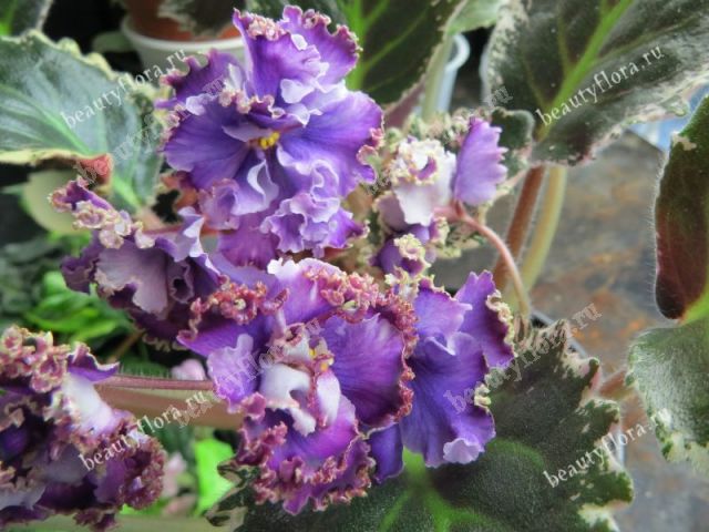 Крупные махровые темные лилово-бордовые цветы со светло-сиреневыми разводами и салатовой гофрированным краем. Волнистые листья с бело-розовой пестролистностью и зубчатым краем листа.