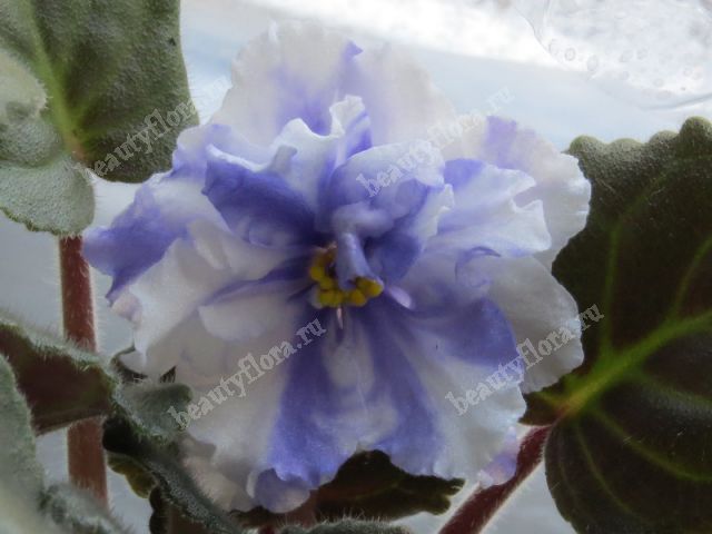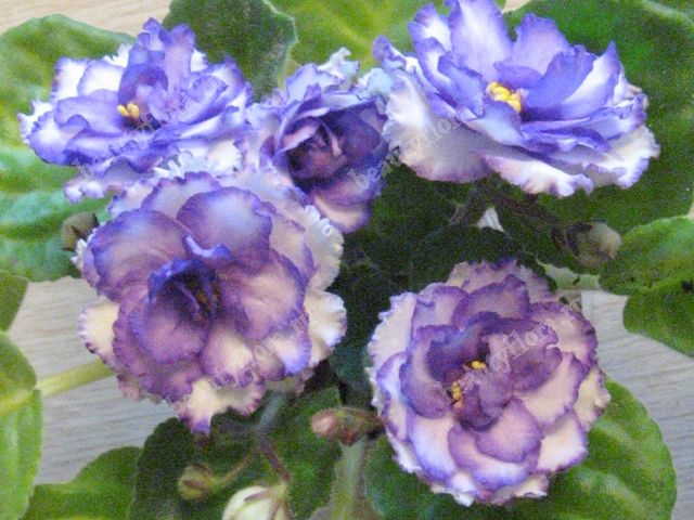 Фиалка Pat Tracey (P. Tracey), Крупные белые сильно махровые цветы с гофрированными лепестками с контрастной сине-пурпурной каймой. Лист средне-зеленый, простой, розетка стандартная.